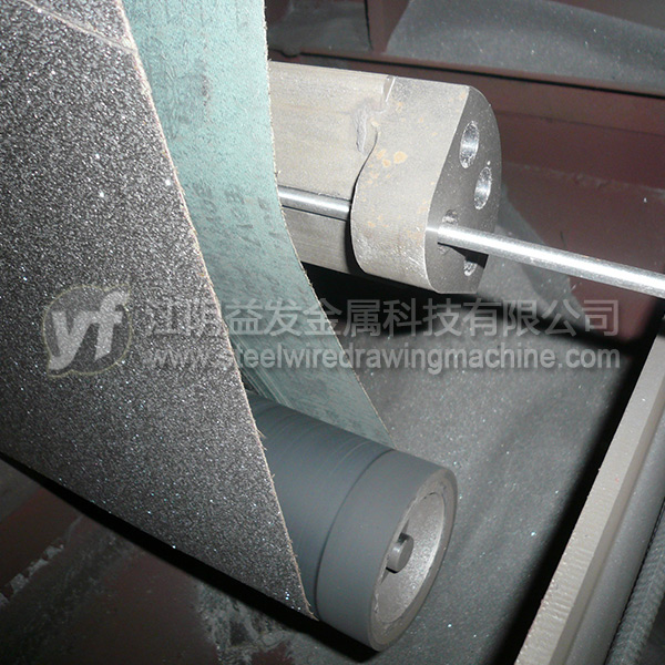 本機采用5.5KW的電機使轉盤圍繞鋼絲360°旋轉,確保鋼絲無遺漏與砂帶接觸,砂帶由5.5KW帶動兩個旋轉的滾筒帶動緊緊壓在線材表面移動,使線材表面被輕微的切削,一般線材表面會被均勻的削除0.03mm,但是砂帶工作時在砂粒之間塞進不斷掉落的氧化皮而使砂帶慢慢失效,通常不會超過24小時,為了提高砂帶的使用壽命,將鋼刷剝殼機放在砂帶機前面,不僅確保鋼絲被100%去除氧化層而且提高砂帶使用時間10倍。